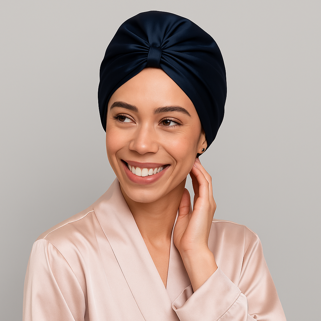 "Een zijden bonnet van deze kwaliteit is meer dan een mooi accessoire — het beschermt het haar 's nachts tegen wrijving, uitdroging en haarbreuk. Tegelijkertijd behoudt het de natuurlijke vochtbalans van de hoofdhuid en kan het helpen huidirritaties te verminderen."