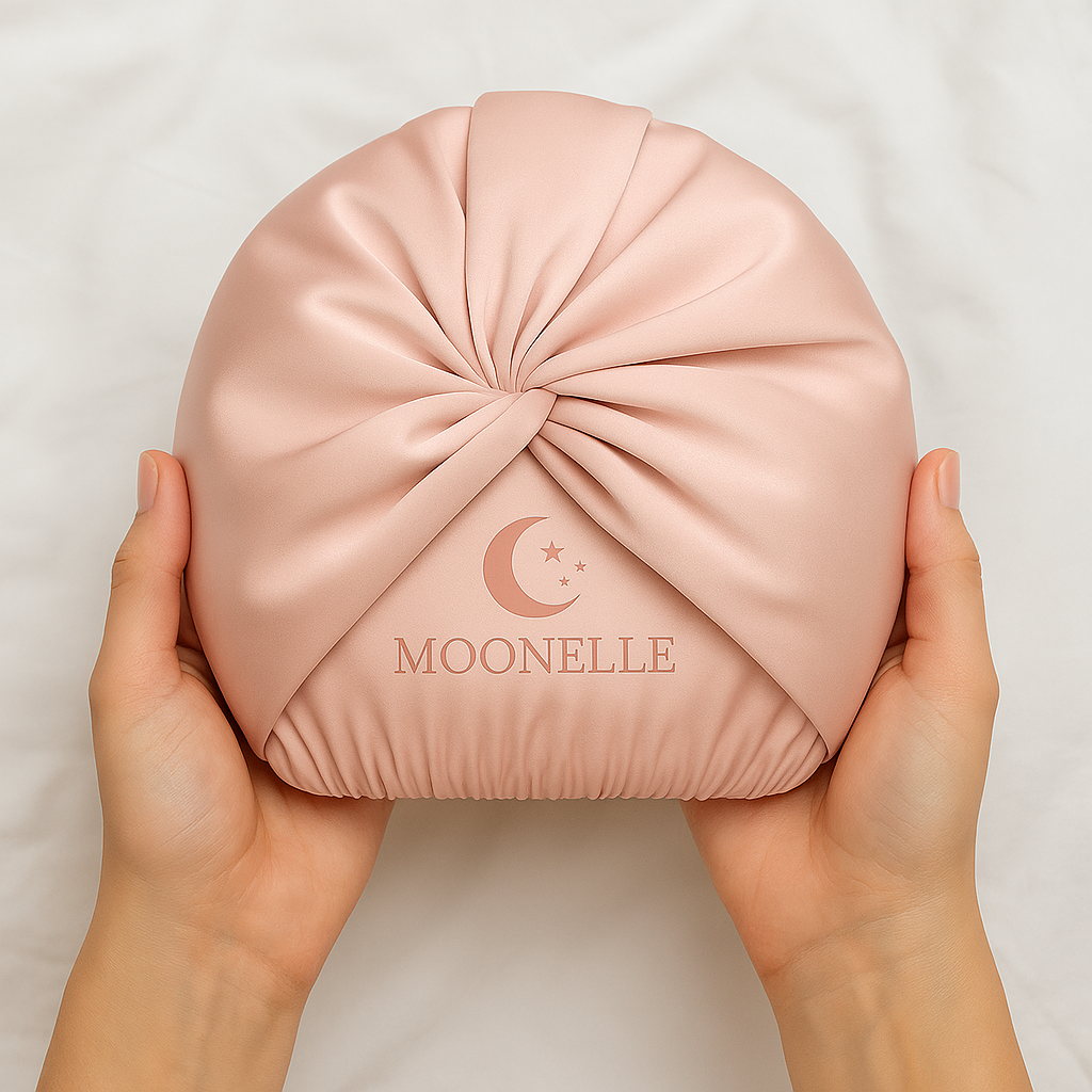 De Moonelle Premium Zijden Bonnet van de fijnste moerbei-zijde beschermt je haar tegen wrijving tijdens de nacht — het behoudt je kapsel, vermindert pluis en ondersteunt de natuurlijke vochtbalans.
